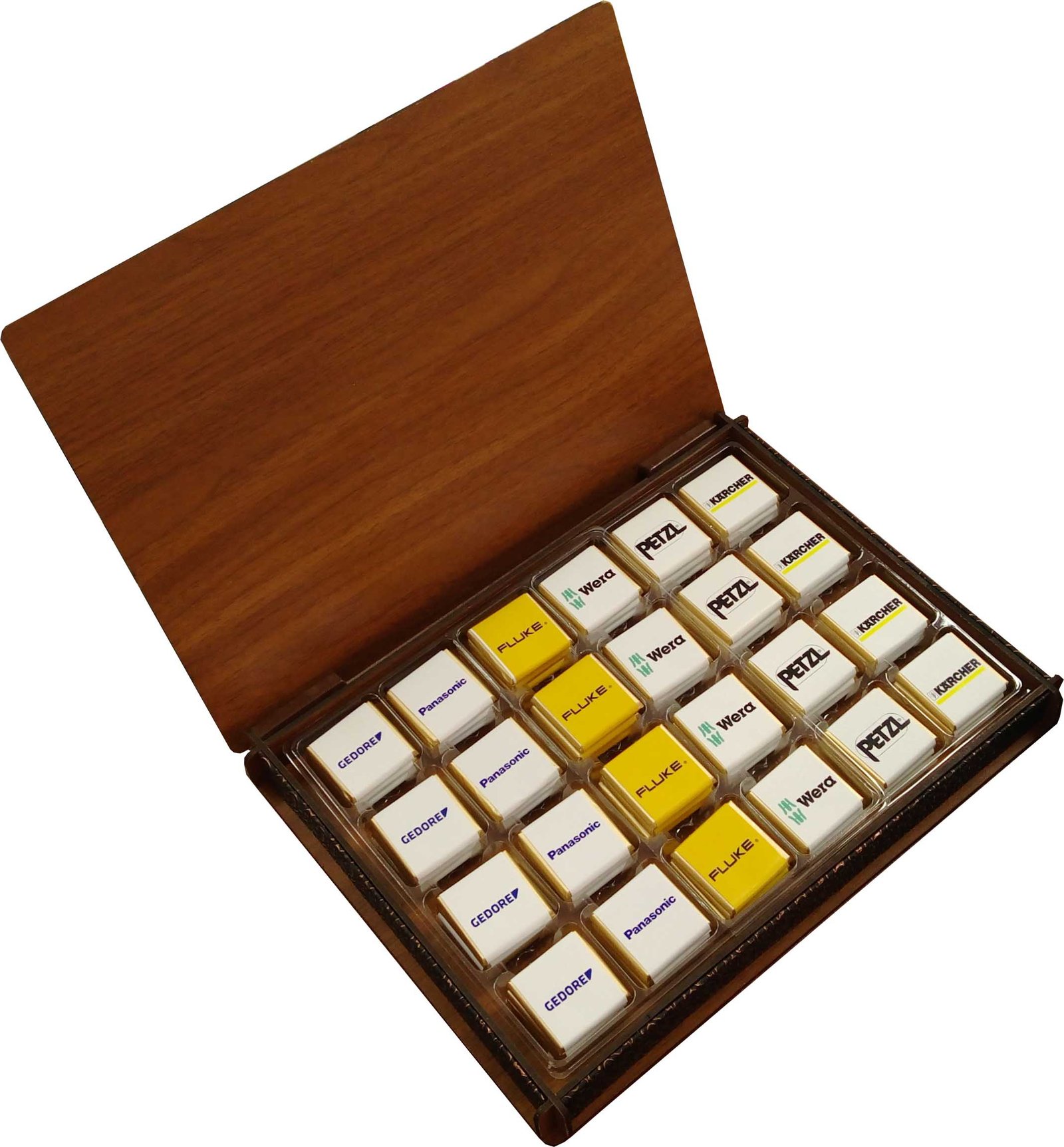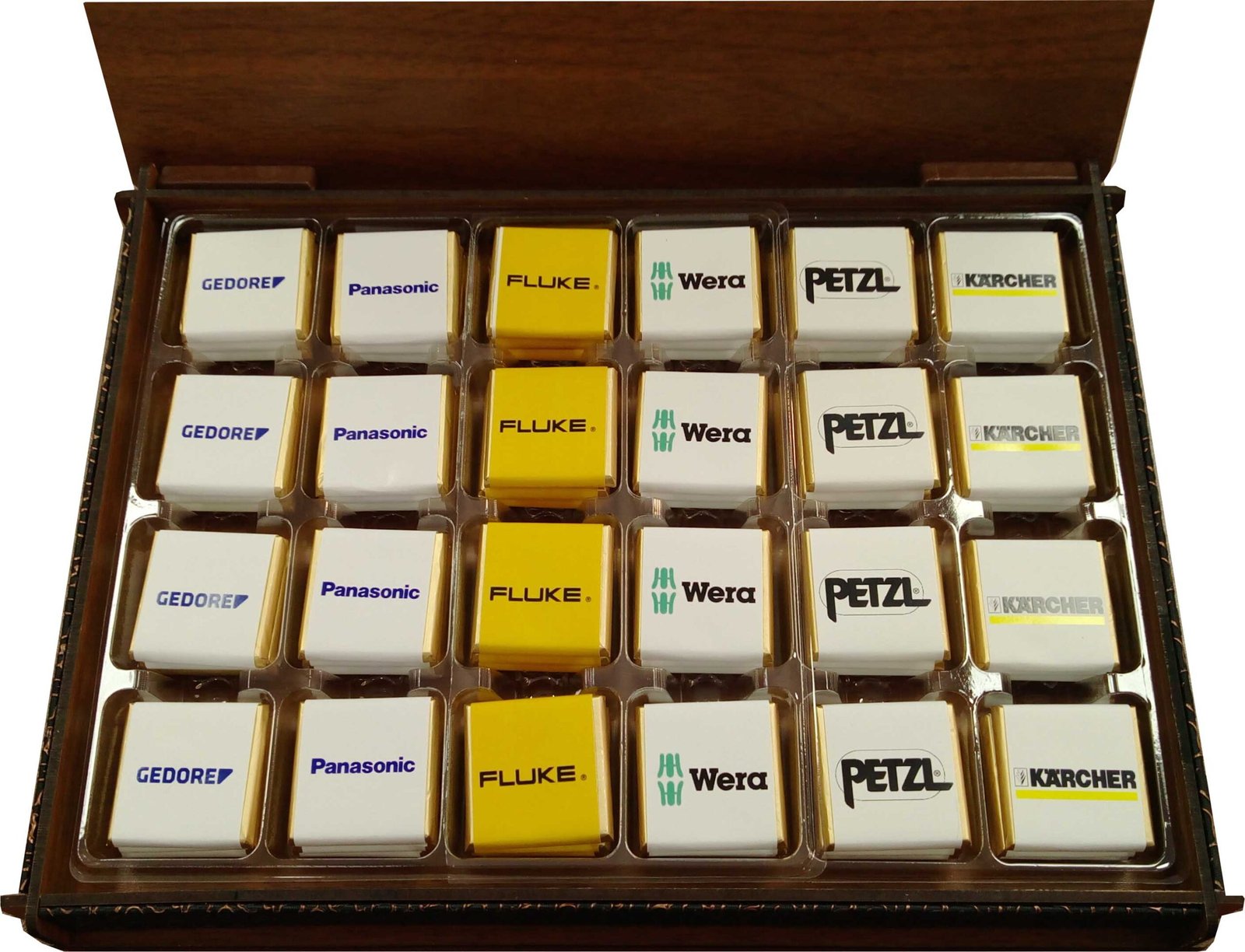 We create custom-made chocolates for your company to offer at events such as openings, trade fairs, meetings, product launches, and special occasions—perfect for your customers, guests, or employees. Whether it’s your company logo, product images, or contact information, we print any visual or text you desire directly onto the chocolates, all prepared hygienically and without human touch.